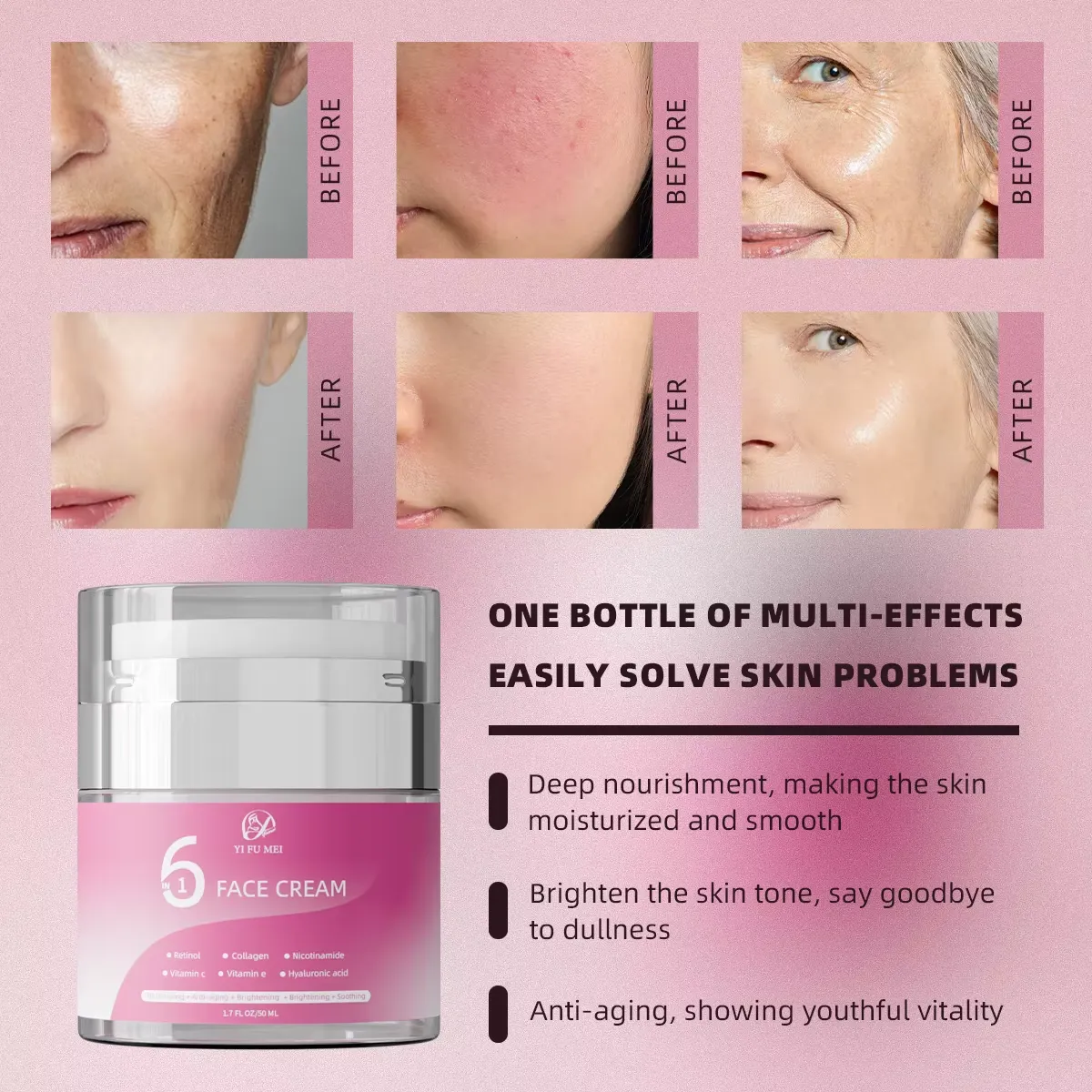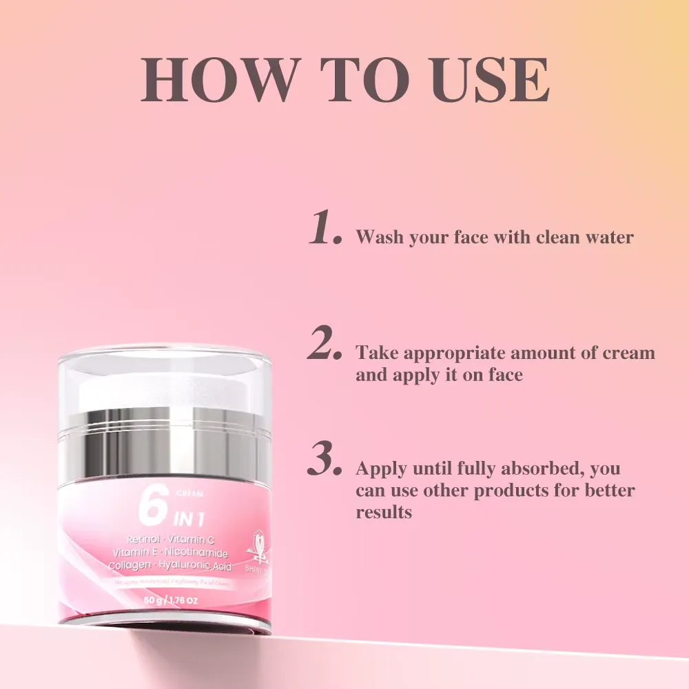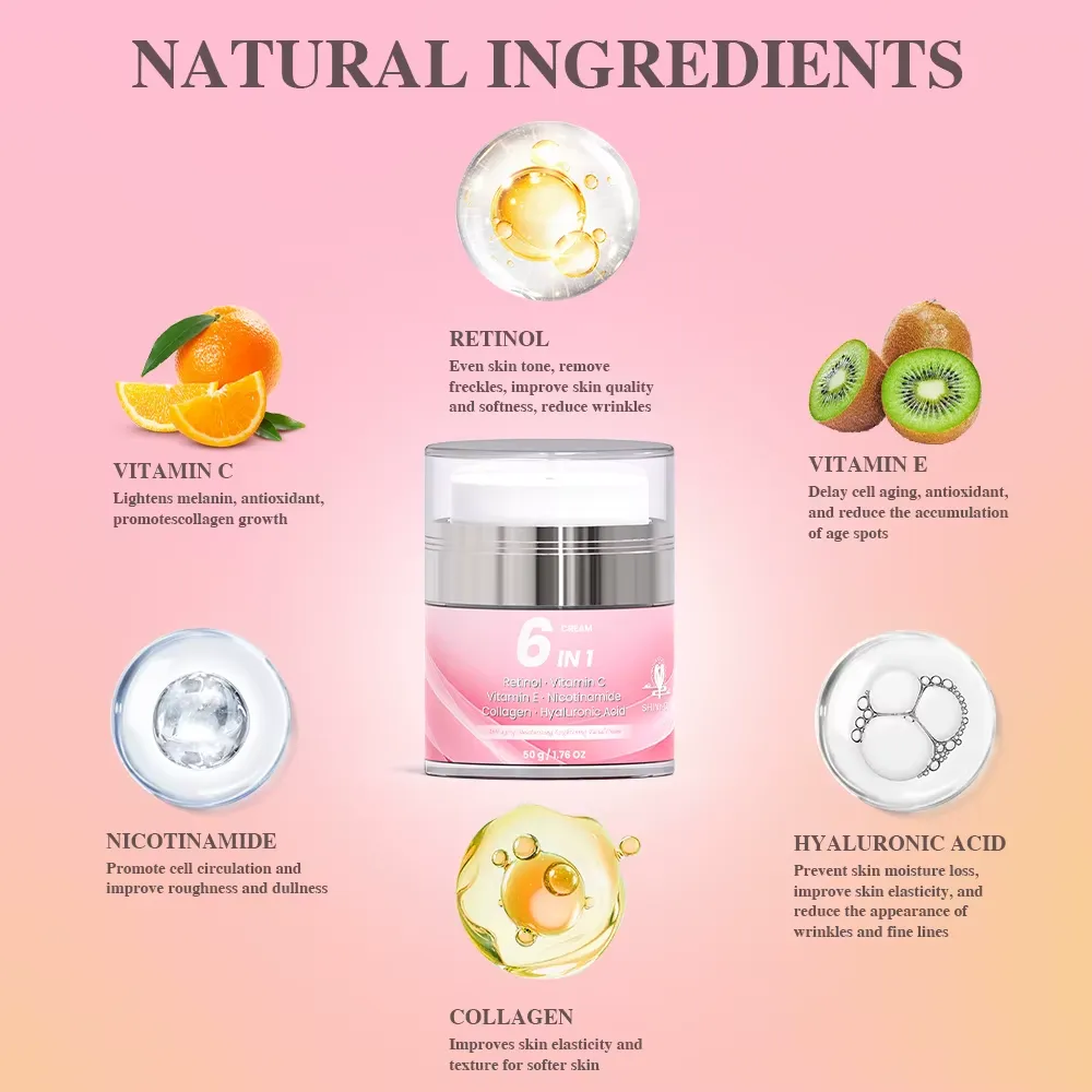 Crème visage multi-action 6 en 1 formulée avec du rétinol, vitamine C, vitamine E, niacinamide, collagène et acide hyaluronique. Elle hydrate intensément, lisse les rides et ridules, unifie le teint et redonne de l’éclat pour une peau visiblement plus jeune et lumineuse.