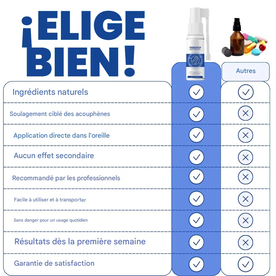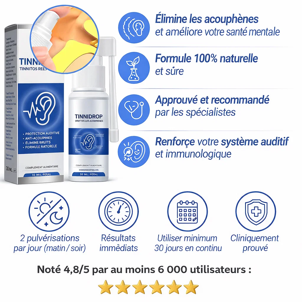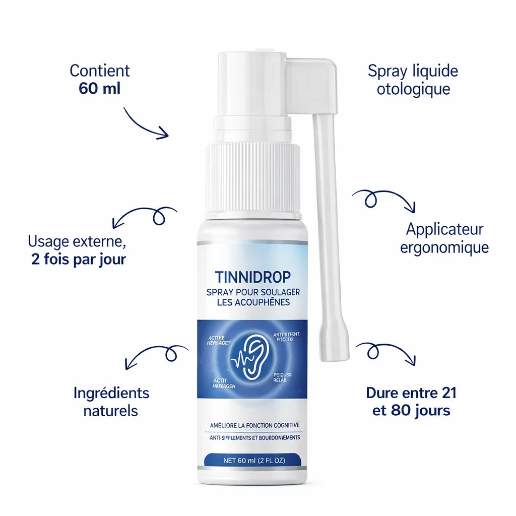 Tinnidrop associe des extraits naturels à une expertise otologique pour réduire les symptômes des acouphènes de manière sûre et non invasive. Sa formule agit directement sur le conduit auditif, favorisant la régénération cellulaire et améliorant la qualité de l'audition dès les premières applications. Idéal pour un usage quotidien et validé par des experts.