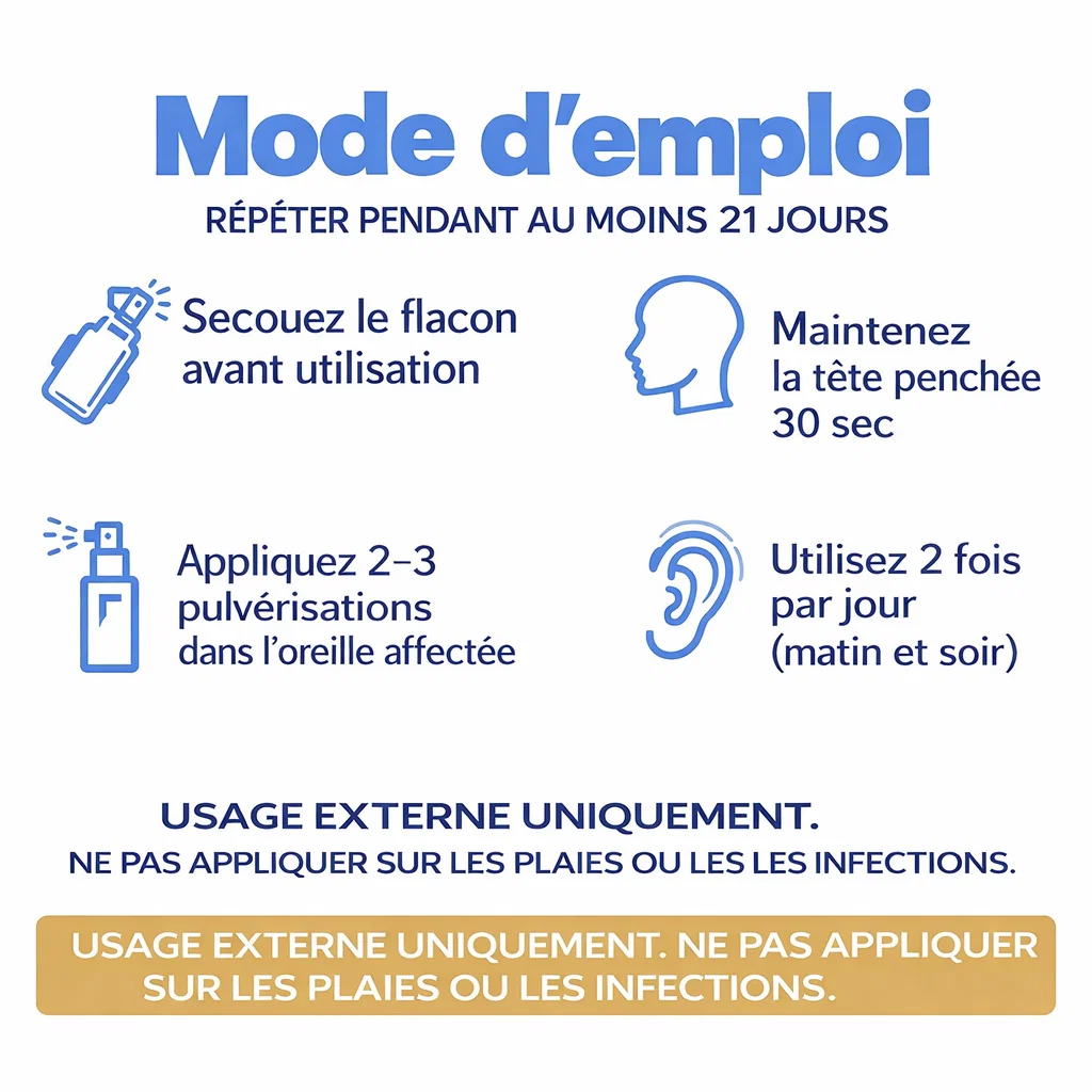 Dès les premières applications, il réduit les bourdonnements, les sifflements et la sensation de pression dans les oreilles. Sa formule 100 % naturelle, à base de ginkgo biloba, d'arnica et de molène, agit directement dans le conduit auditif, réduisant l'inflammation et apaisant sans effets secondaires.
